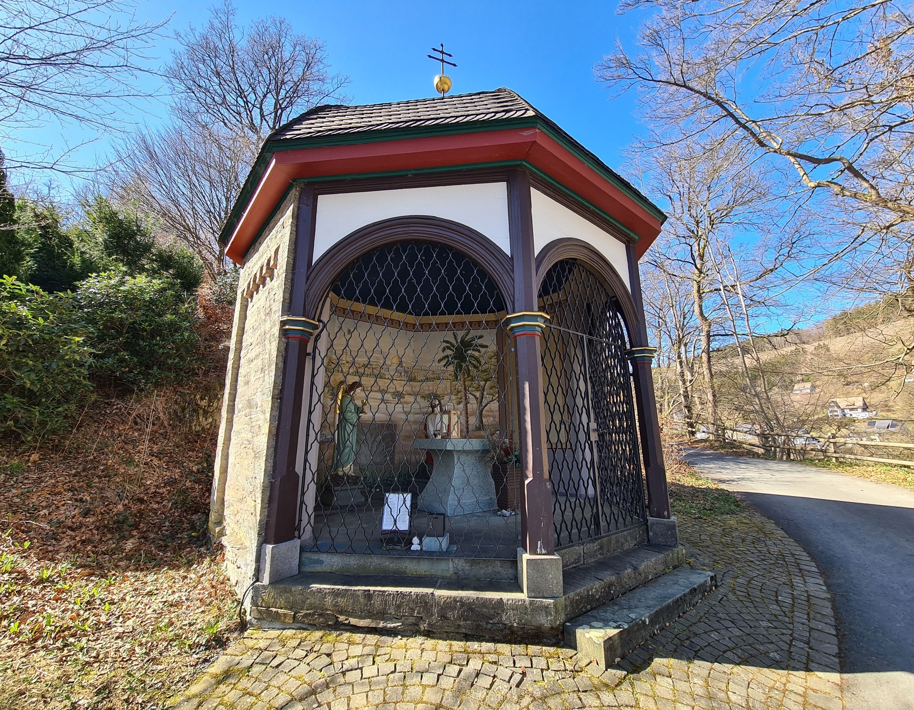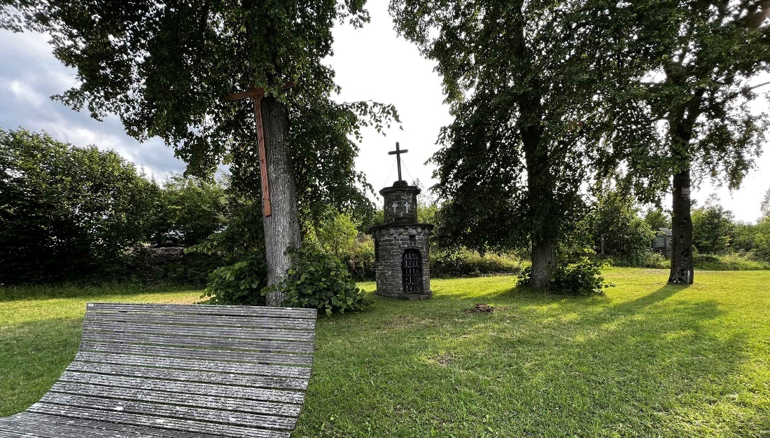 Nachdem Sie die Aussicht genossen haben, setzen Sie Wanderung fort. Hinter der „Pütte“ führt der Weg rechts über einen Pfad mit einem Kreuzweg hinab bis an die Bebauung von Oberkirchen. Der Weg endet oberhalb des Bildstocks „Blutschwitzender Heiland“. Dort wenden Sie sich links und an der nächsten Kreuzung wieder links.