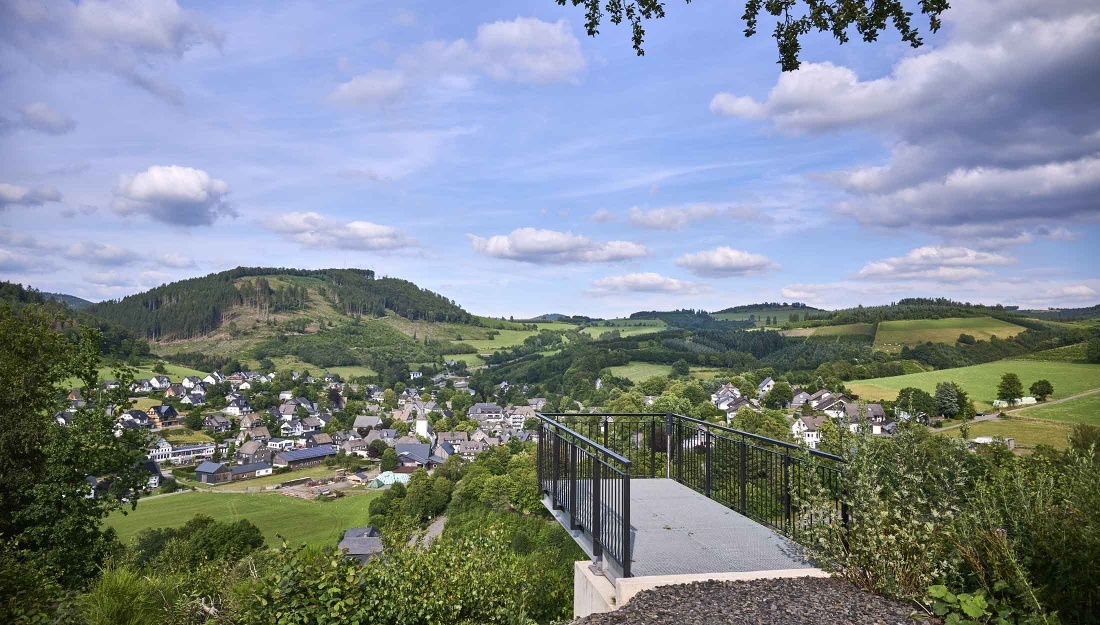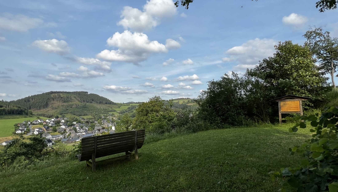 Am Wanderparkplatz Almert überqueren Sie vorsichtig die Straße und gehen über den Fußweg mit diese einige Meter bergab. An einem Wegweiser (2te Möglichkeit) biegen Sie links ab in Richtung Pütte. Folgen Sie dem Weg mit Blick auf die „Riemeske“ und Oberkirchen bis zur „Pütte“ (alter Brunnen) und den Dorfbalkon. Vom Balkon genießen Sie den Blick auf Oberkirchen und das obere Lennetal. Hier befindet sich auch die Station „Dorf in der Landschaft“ der Fotoroute Oberkirchen vom Fotografen Klaus-Peter Kappest.