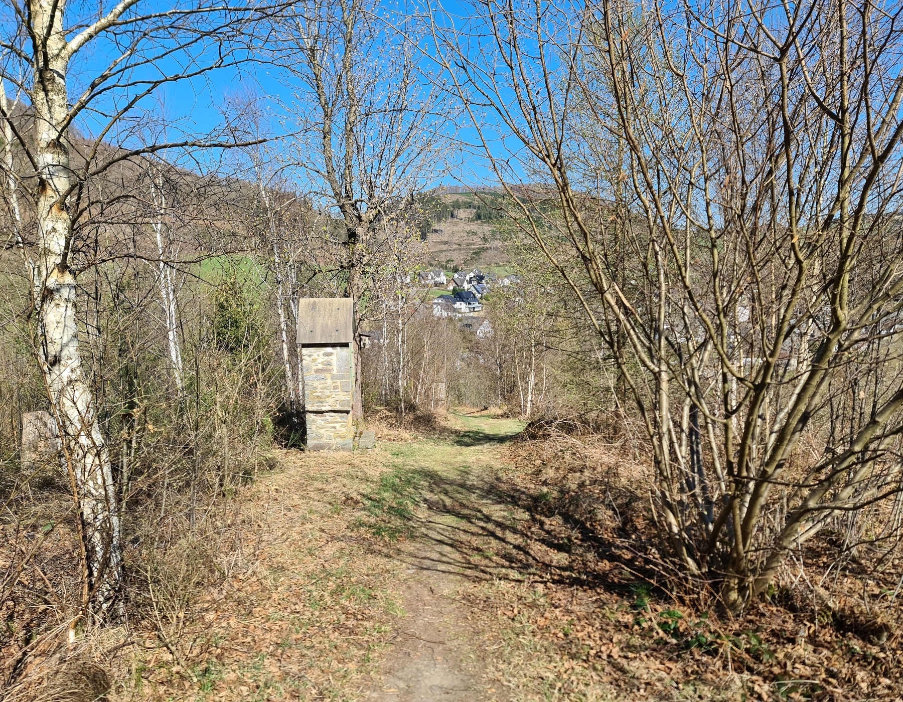 Wenn Sie den Bildstock besuchen möchten, gehen Sie an der Bank mit einem kurzen, steilen Pfad hinab, wenden sich unten links und weiter bergan, bis an eine Kreuzung. Hier treffen Sie wieder auf den Weg und das Zeichen A7. Die Wanderung führt Sie nun immer geradeaus, parallel zur Lenne bis zum Ortseingang von Winkhausen.